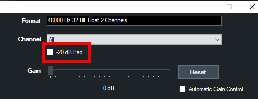 To fix this, in the Audio Settings window for the input tick the -20dB Pad checkbox.